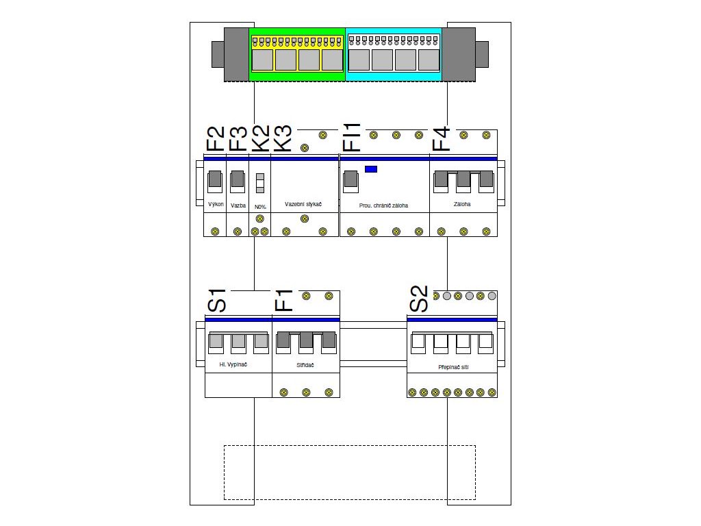 Rozvaděč se instaluje jako další "spotřebič" k vašemu domovnímu rozvaděči. Do rozvaděče se pak připojuje střídač, zálohovaný výstup ze střídače.